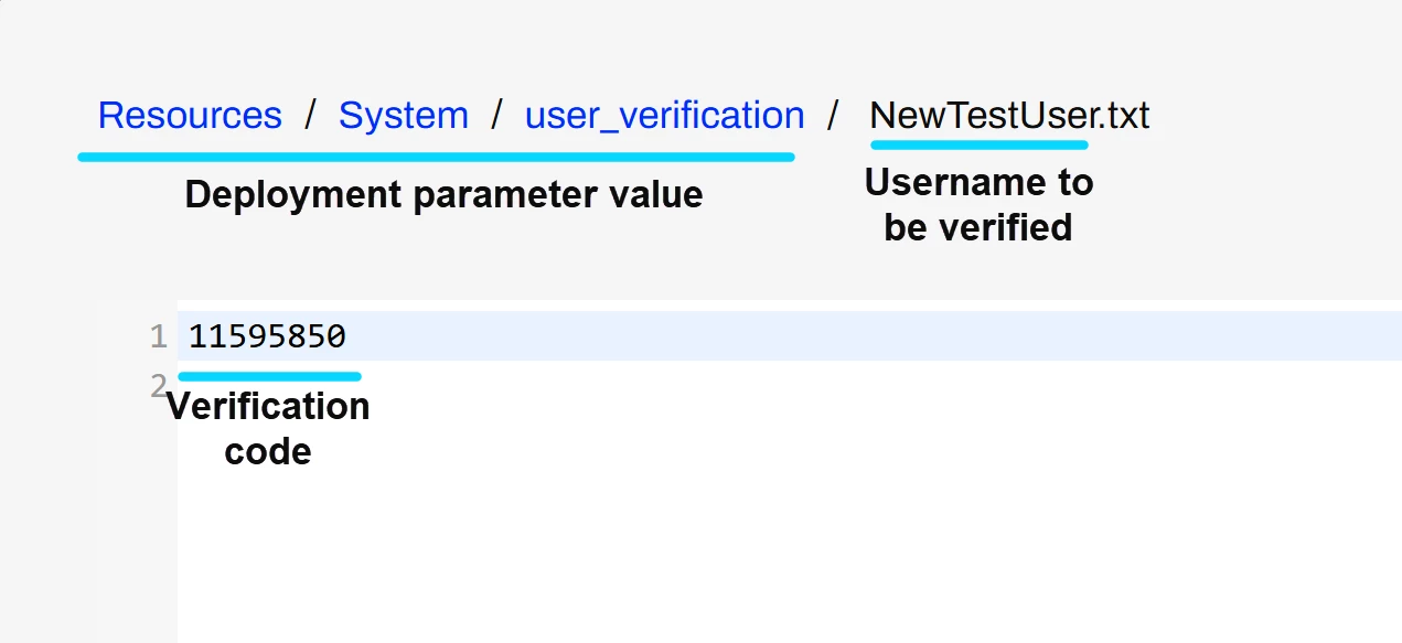 Verification codes are stored within Resources/System/user_verification/, referenced by the temp_user_verification_folder deployment parameter. These should only be accessible to admins.