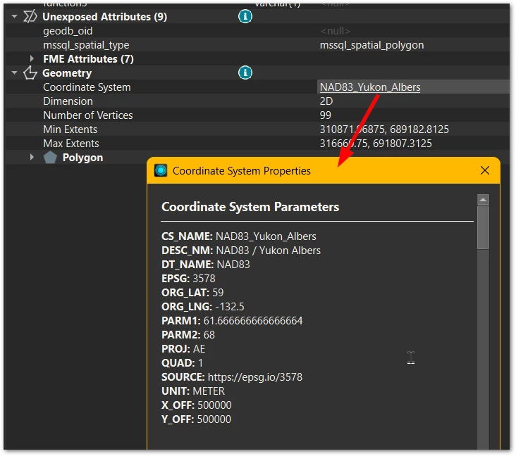 The Feature Information inspector on the incoming data stream says the item has a coordinate system and is happy to display it. The OGC WKT from that dialog is:
