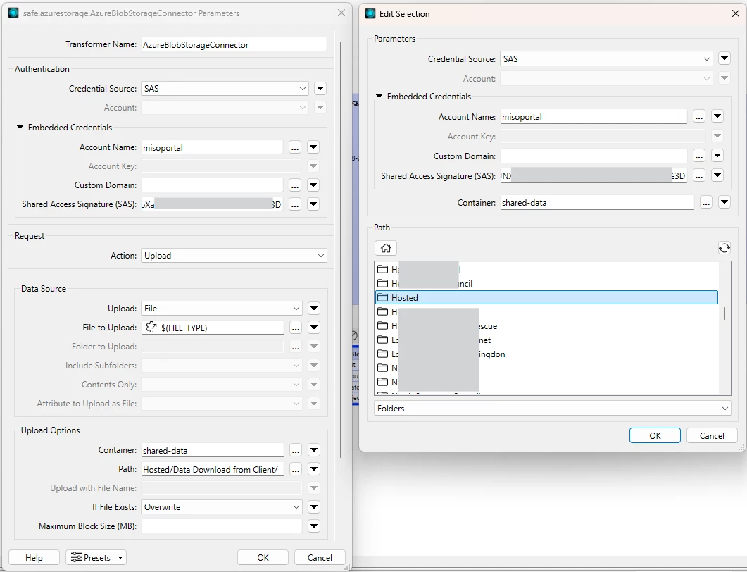 I can connect to the “Hosted” folder inside the container “shared-data”. I am connecting using SAS.