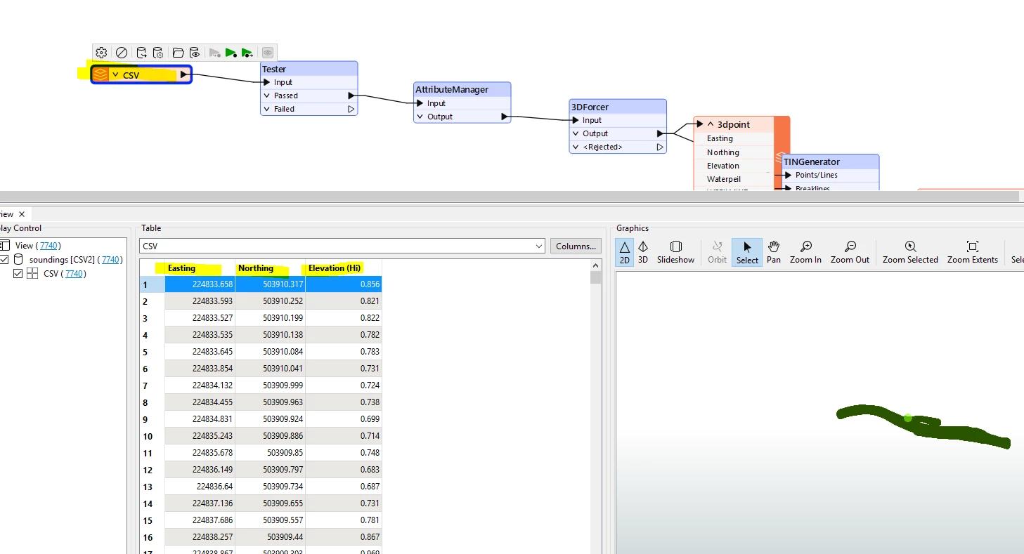 All I want to do is create a TIN from a point CSV. I have used the TINGenerator transformer, but the TIN that is created does not have any elevation. The geometry is 3D in the Inspector, but it does not show any height information. If I create a TIN in ArcGIS, it has the correct elevation. I will also post my workflow. Can anyone help me?
