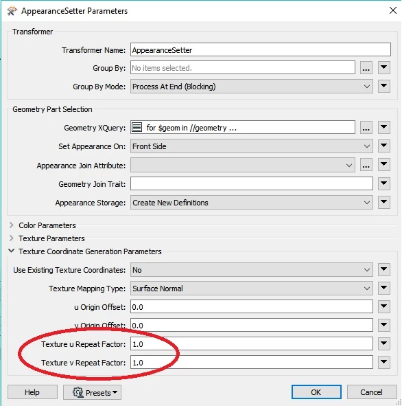 Good question - you've found the correct right parameter to get this done. By default, these values are set to 1.0 and 1.0 which will apply the appearance once to the entire geometry. If you want the appearance to repeat, you can adjust this value to the number of times you want it to repeat.