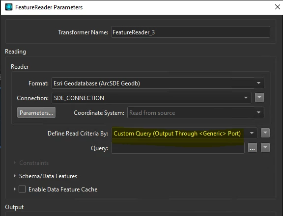 Looking at the new Define Read Criteria By: Custom Query option in the FeatureReader in 2025.1