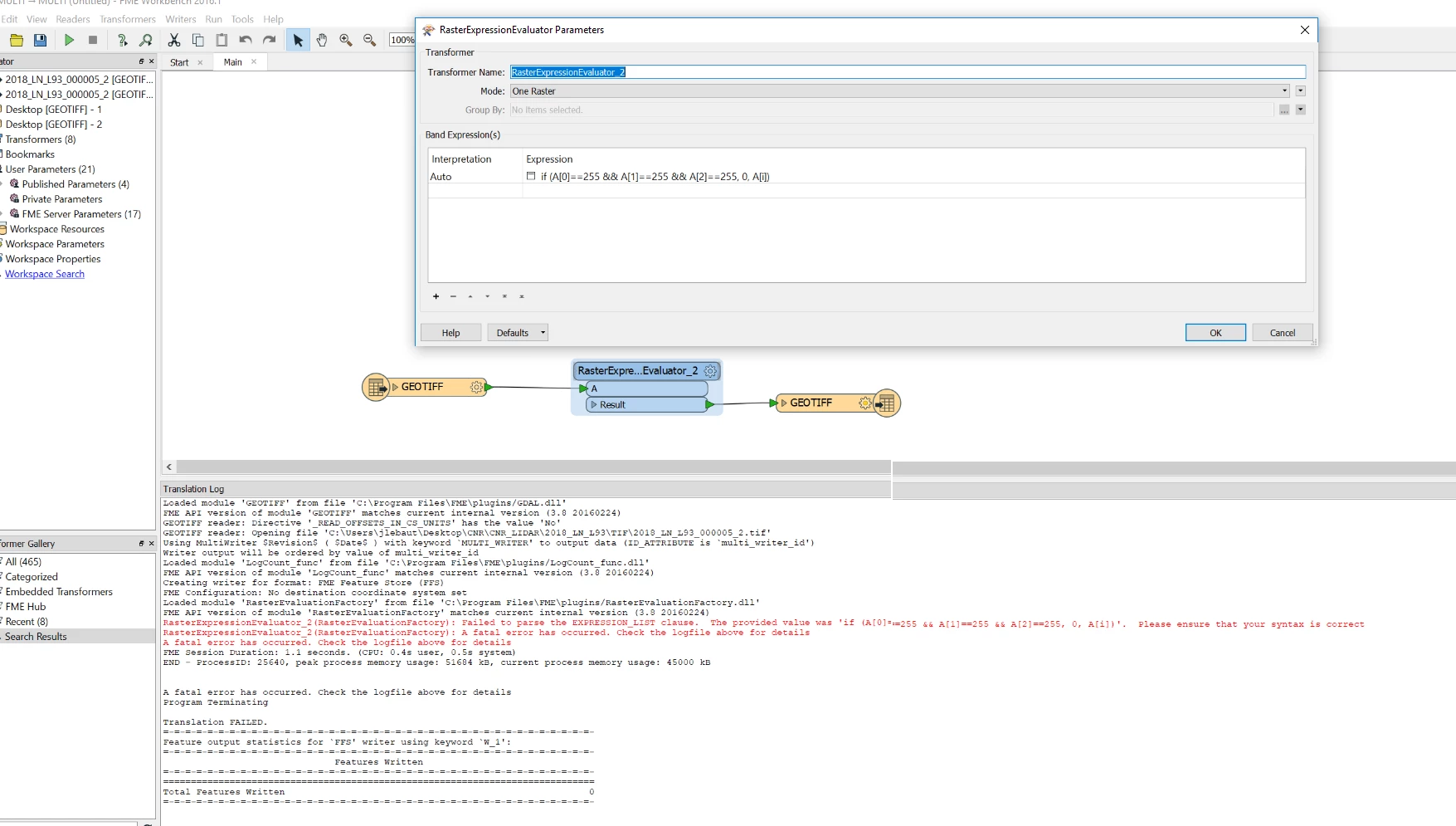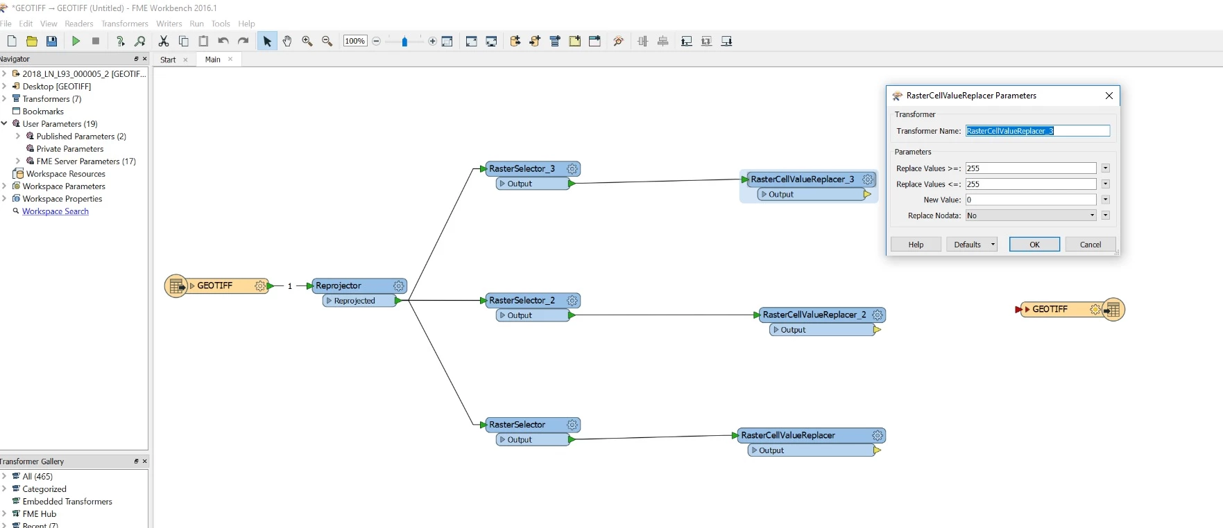 I have separate my 3 bands (RGB) with the RasterSelector, and I have apply RasterCellValueReplacer on each band. But, I wonder how to do the replacement only if the pixel has the value 255 on each band (RGB).