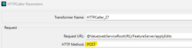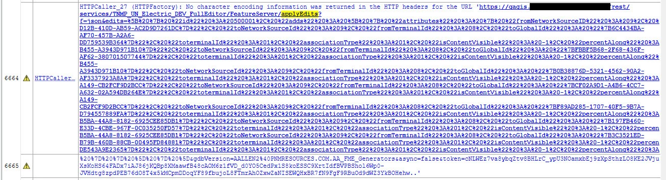 I’m using an HTTPCaller to applyEdits using ESRI’s REST API. It includes sending along some JSON to add to a table in a feature service. The workspace runs successfully testing with 1 or 2 records in the JSON parameter, which is all sent with a single HTTP call, but fails when testing with 10 records. It looks like FME is truncating the HTTP string, which causes the request to fail. That’s what it looks like in the FME log anyway; the query string appears on two lines (see attached screenshot). If I try applyEdits in a web browser at the REST endpoint and paste the JSON in manually, I can add the data without issue. Is there a parameter or formatting change I need to make to keep FME from truncating the HTTP call? (FME Desktop/Form 2023.2.2.0, build 23764)