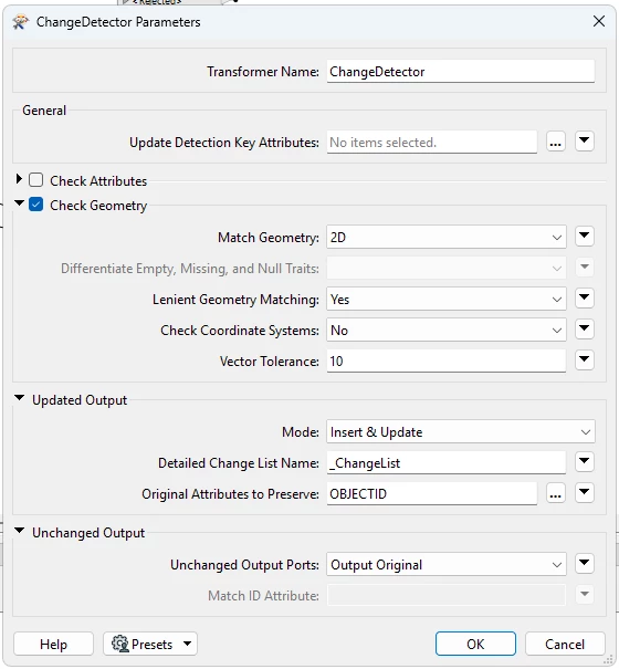 I used the ChangeDetector transformer with a tolerance of 10 to compare the geometry between the 2 datasets. The output is about half of the features. Would it be possible to now use that output and compare the street names? i.e. identify segments with street names that do not match.
