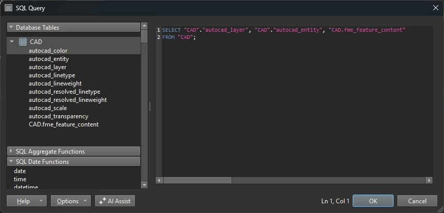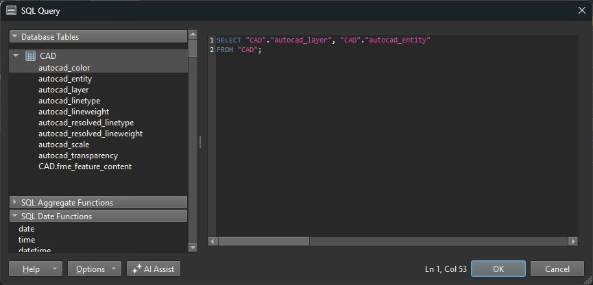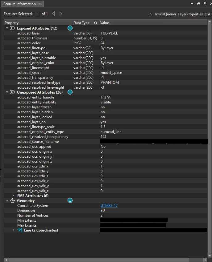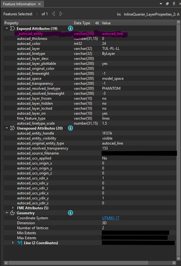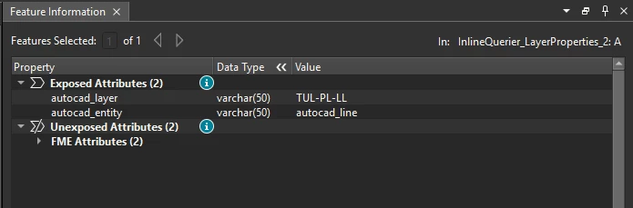 In a workspace processing AutoCAD data, I have recently replaced a bunch of transformers with an InlineQuerier, and downstream of it is an AttributeFilter, filtering on the autocad_entity attribute. Because of this, I found that the InlineQuerier is dropping this attribute, regardless of whether it’s exposed when entering.