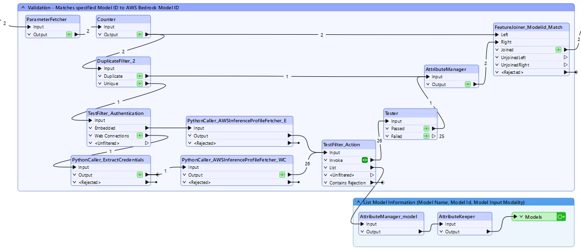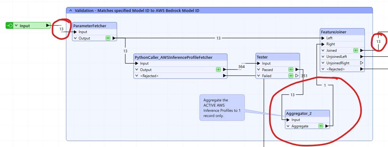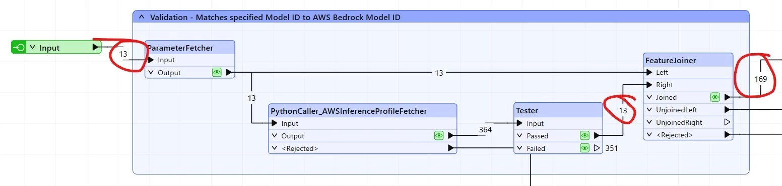 By embedding the transformer and then editing it, I was able to view the flow of information from a source workspace. The issue seems to be in the calling and validation of AWS Inference Profiles, in that they are checked to be active, and then joined back to the original input records (obviously to allow error checking and rejection). As downloaded, the transformer looks like this:
