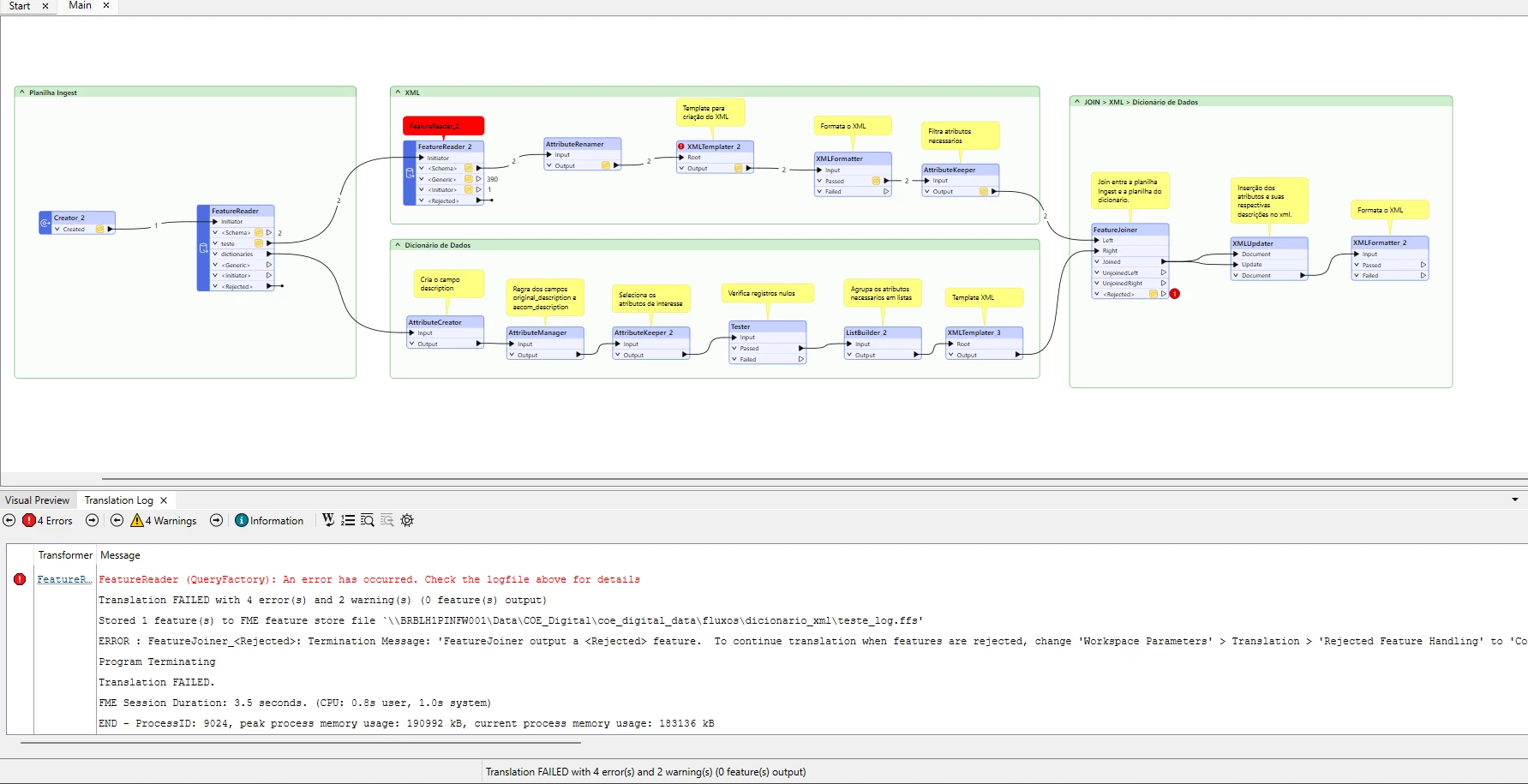 After adding FeatureReader_2, the reading order started prioritizing the XML block. Then, a join occurs with the Data Dictionary block, but since the XML is fully read first, when the flow reaches the FeatureJoiner, the data dictionary has not yet been processed, causing an error.