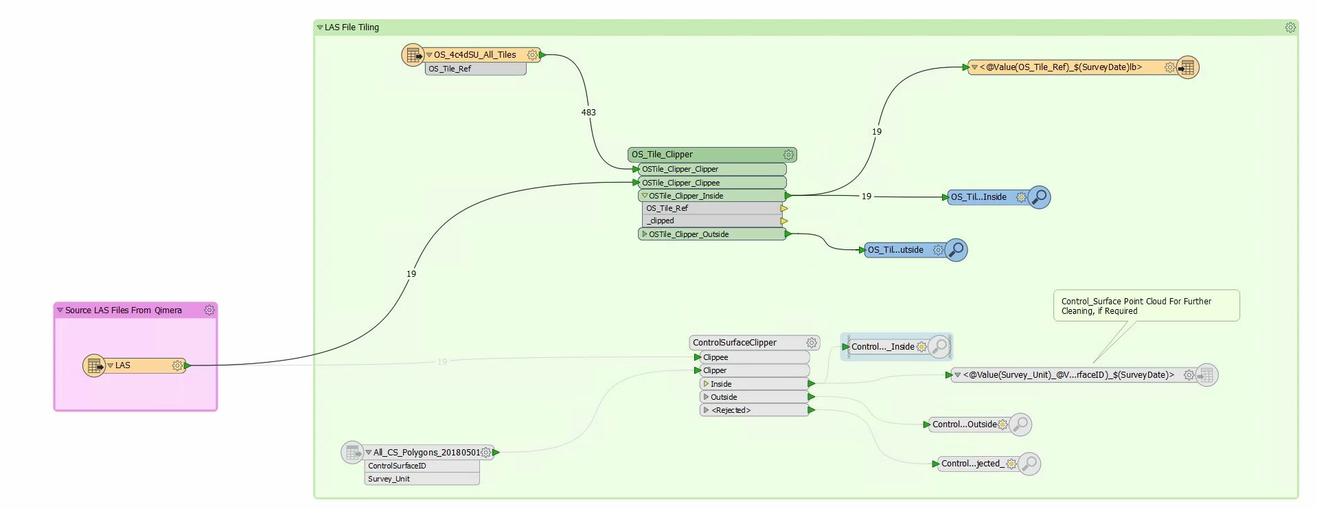 I'm having problems using the Clipper transformer with 19 las point clouds as the input / clipee and a MapInfo tab file as the clipper, with the output being written as LAZ files. The workspace works fine if I just run it in isolation, as shown below: