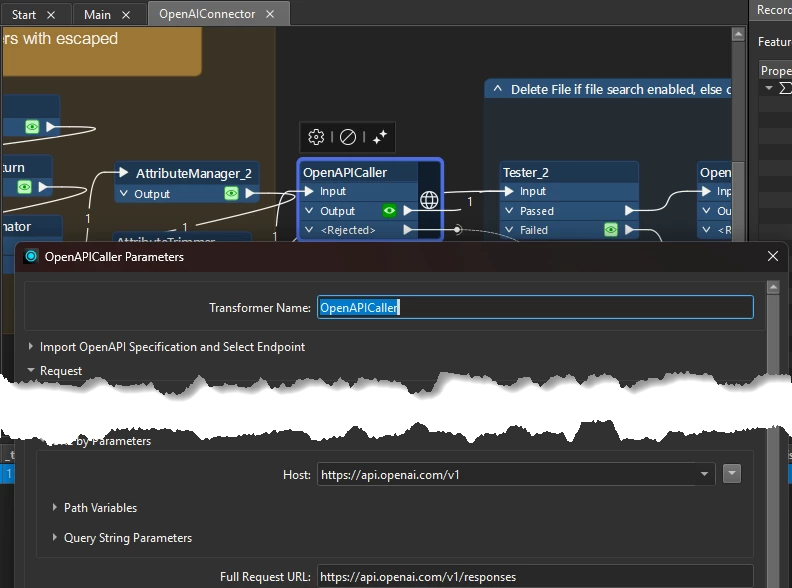 Hi, Thanks I am using the - OpenAIChatGPTConnecter and one of the parameters to enter is the endpoint. I agree it looks firewall related. I see the openapi caller needs a json file to enter the credentuals required. I can maybe look at this method but probs get same issue. I think the model used on our AI platform is GPT-5 this options diesnt seem to be available within the OpenAIChatGPTConnecter transformer - maybe this is the issue.