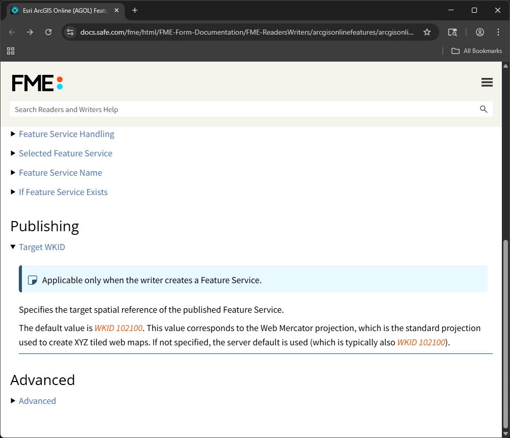 If I am understanding the documentation correctly, this parameter is only needed if the writer is creating a Feature Service. However, as the default is set to WKID 102100, if you don’t change this to the correct WKID, it will write the data out to the wrong location. I initially made this mistake before I realized I had to input my data’s WKID.