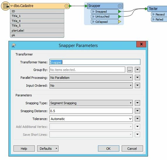 I am trying to clean our cadastral polygons, eliminating gaps, overlaps, missing vertices at intersections, etc. I have tried the Snapper, GeometryValidator and AreaGapAndOverlapCleaner transformers but some of the polygons are regenerated with additional vertices due to the adjoining polygons missing vertices at intersections, where I would have expected them to be broken and a vertex added. I need the recommended transformers, with the correct parameters, that can clean up the topology of our cadastral polygons. I also wish to retain the data of all the attribute fields, if rebuilding the polygons is necessary.