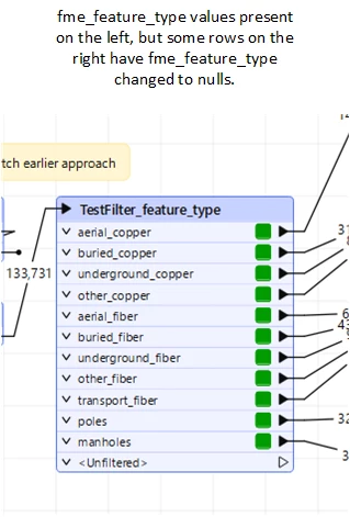 I recently tried to update an older workspace with a TestFilter that is used to branch data out using basic logic. After the update, the workspace failed in an odd fashion and after a bit of troubleshooting it turned out that one of the tested attributes, “fme_feature_type” in this case, was getting changed to nulls for many, but not all of the resulting rows. The change was from TestFilter Version 2 to Version 3. Has anyone else experienced anything similar? I’m running FME Form Build 25815.